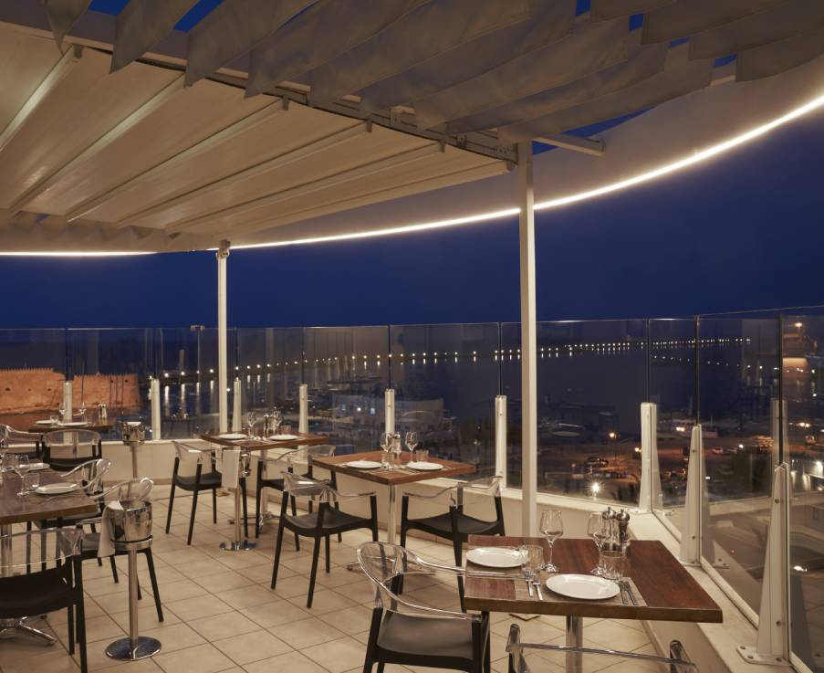 Located Just a few meters off 25th August Str in downtown Heraklion, Lato Boutique Hotel hides a very pleasant surprise for those who know where to look. The hotel’s roof garden is home to one of the most impressive rooftop restaurants with a sea view to Koules Venetian Sea Fortress. A discrete sign of the Herbs’ Garden Restaurant at the building’s entrance marks the spot for the beginning of a wonderful culinary journey that blends Greek homemade tastes with contemporary gourmet gastronomy on a charming terrace that makes you think you can touch the sky if you stretch out a bit.